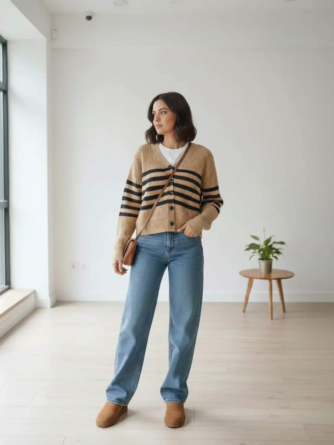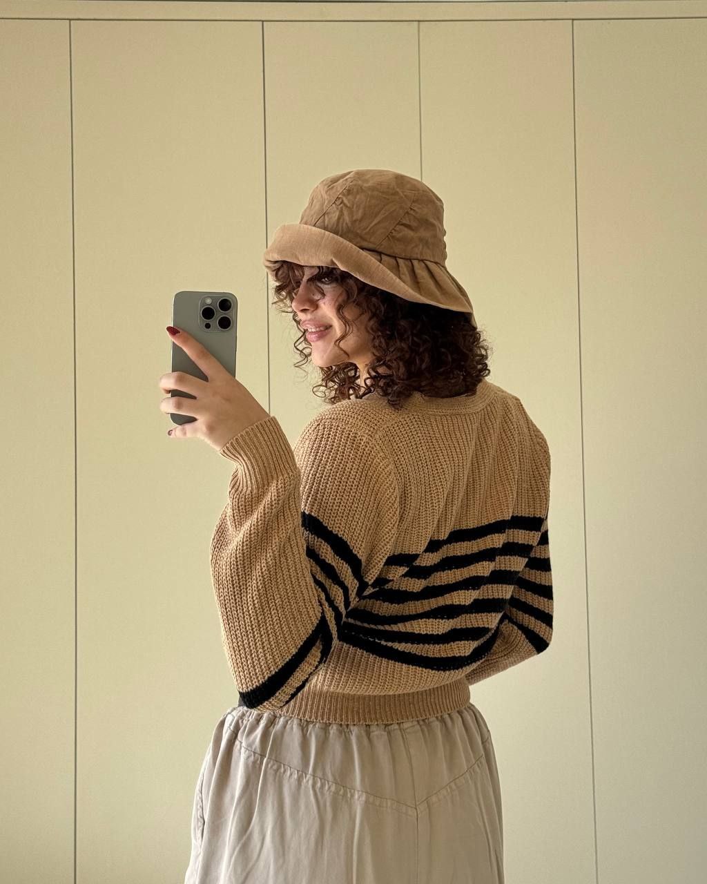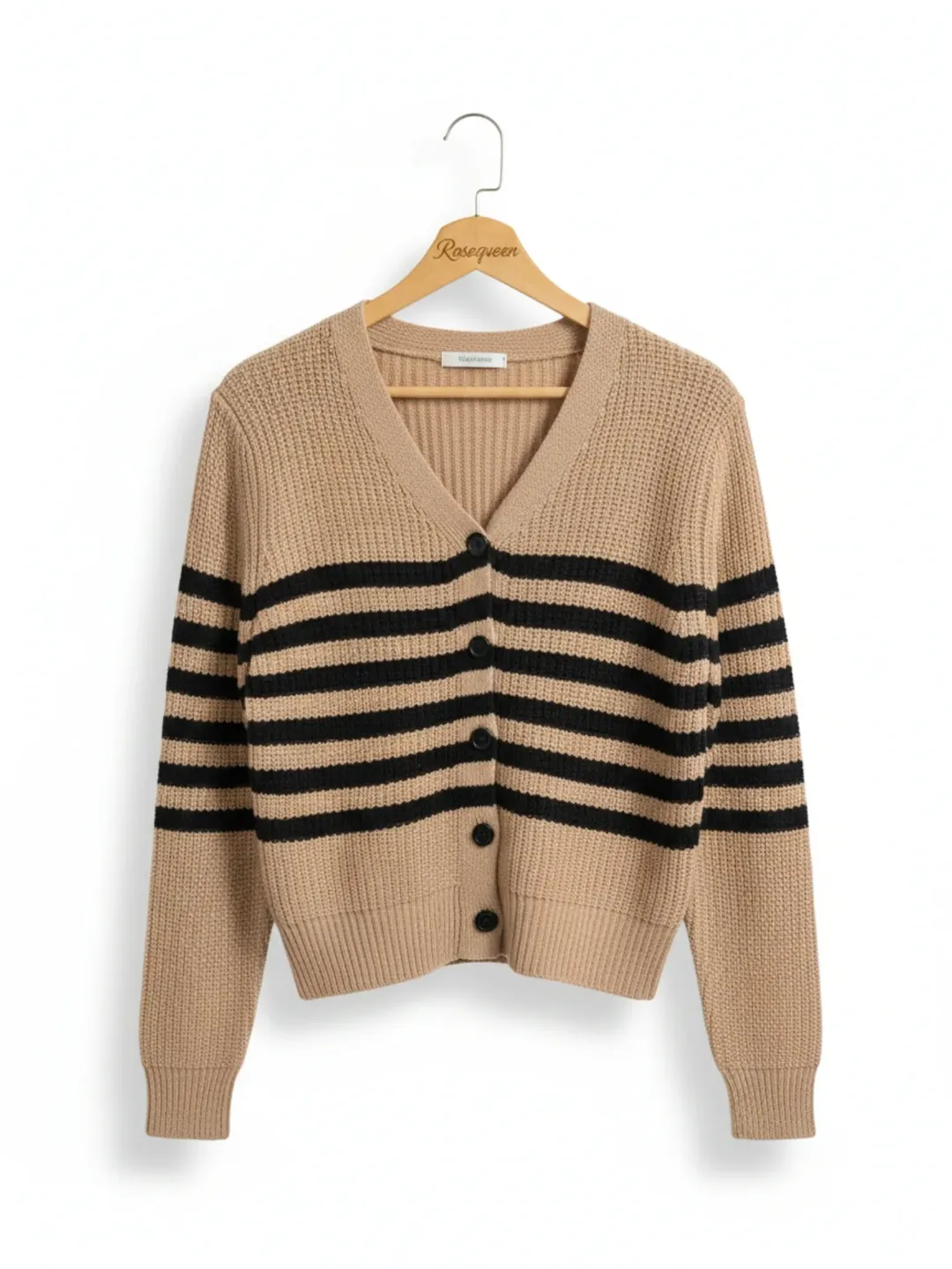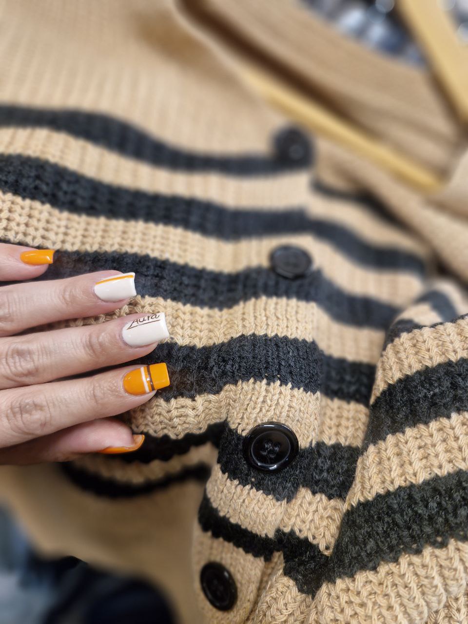کاردیگان بافت وارداتی نسکافهای با طراحی راهراه مشکی، سبک و خوشفرم مناسب برای روزهای سرد. این کاردیگان حس "گرم و شیک" را به شما میدهد.