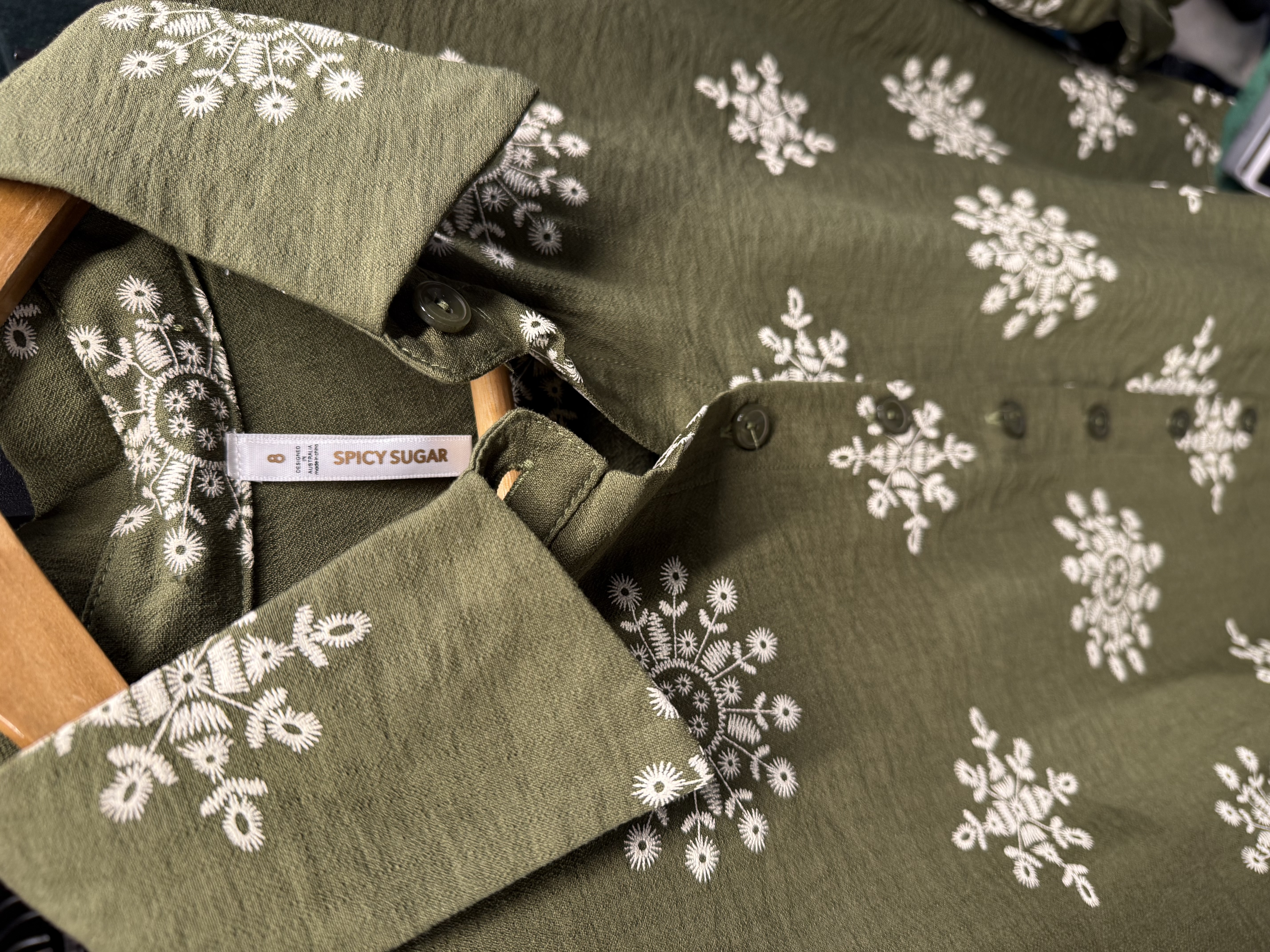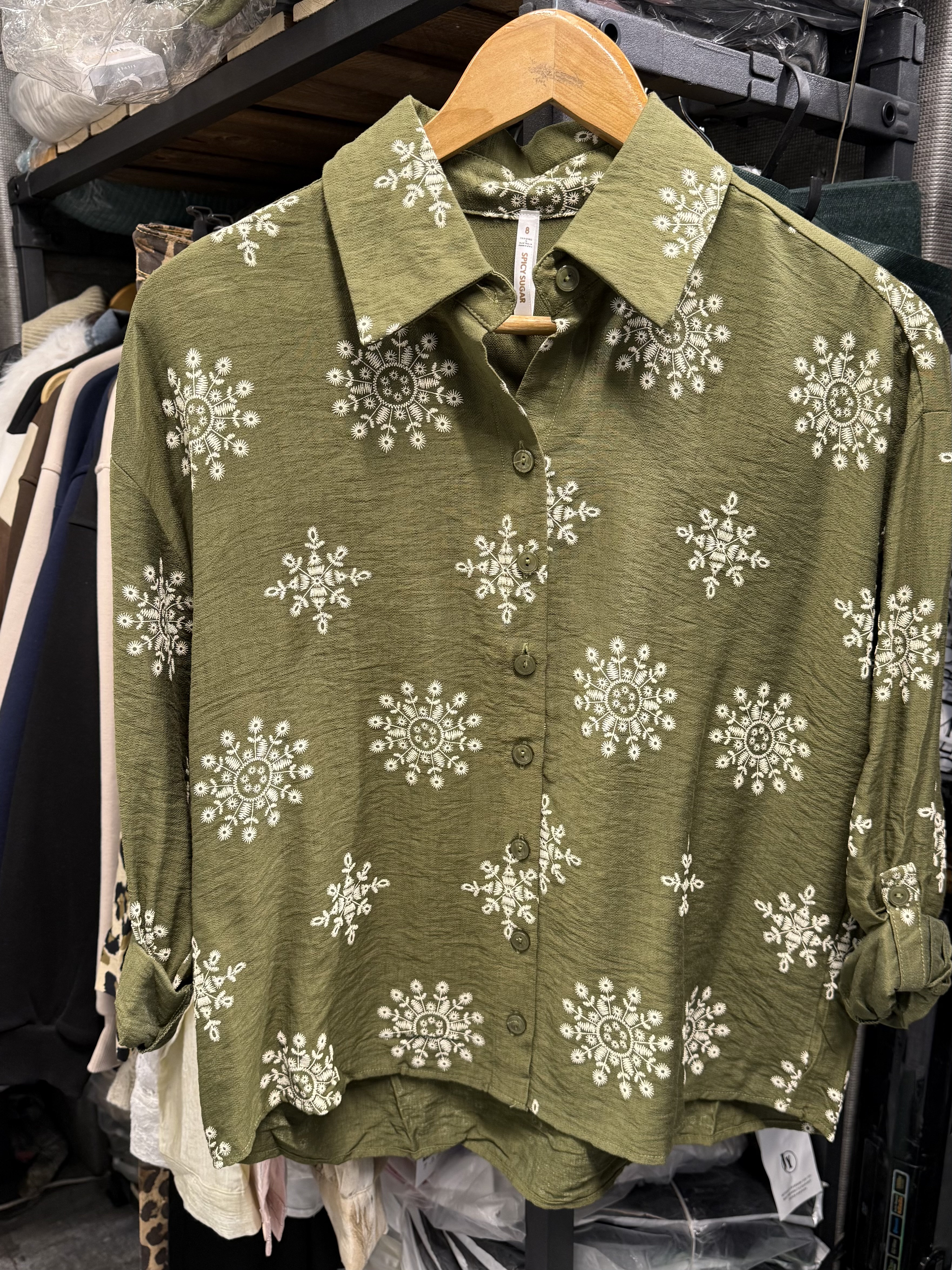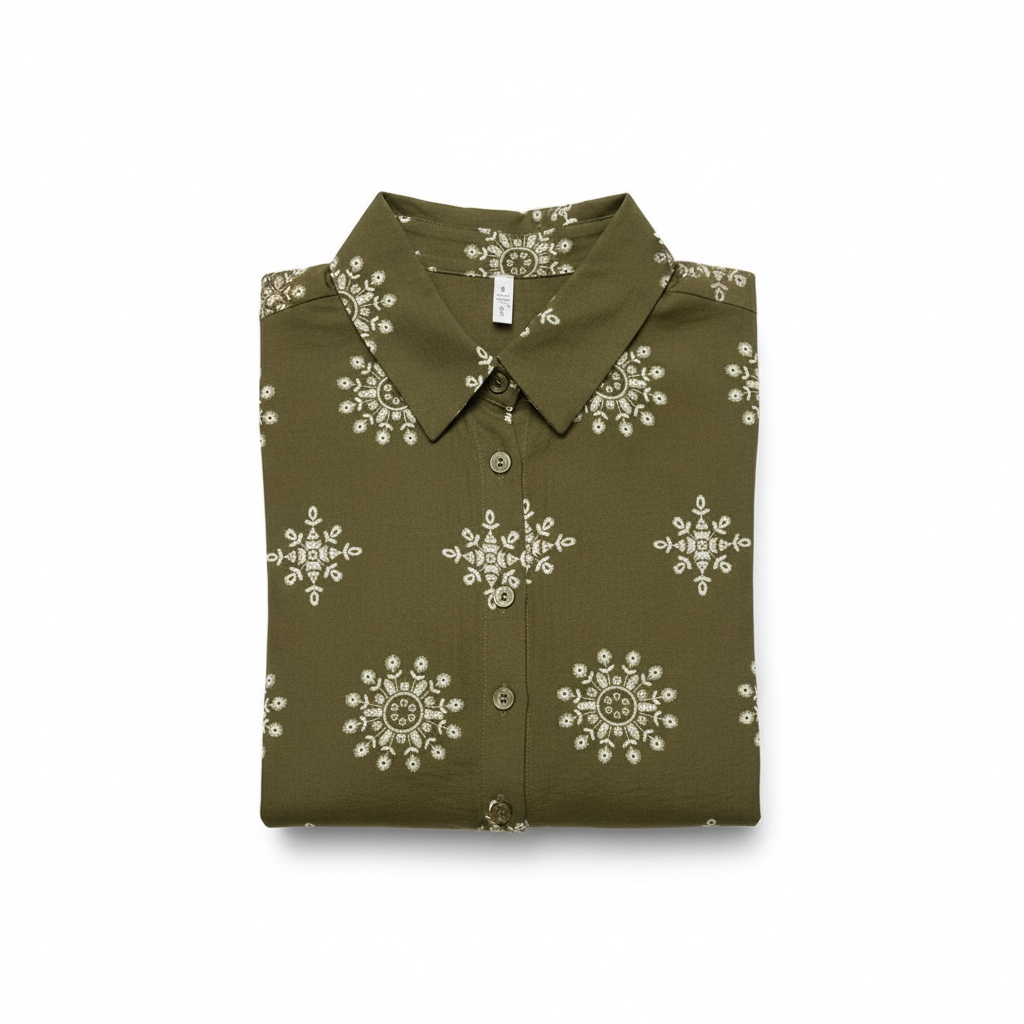 کپ لباس باکسی است و طرح های ماندالا چاپ شده روی شومیز نمای گلدوزی شده دارد و شومیز بسیار شیکی برای استایل های روزمره و مهمانی است